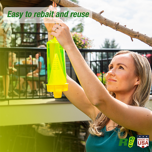 The RESCUE! Reusable Yellowjacket Trap has a unique trap design that prevents yellowjackets from escaping. Yellowjackets fly in through holes in the bottom of the trap, then continue upward through the interior cone and become trapped within the outer cylinder. The yellowjackets eventually die of dehydration. Our trap's durable construction holds up in sunlight for many seasons of use, and its clear plastic walls allow you to see the yellowjacket "body count" so you can empty the trap when full.