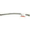 16", braided stainless steel, faucet connector, 3/8" female compression thread x 1/2" iron pipe female straight thread. Exceptional flexibility for fast, easy installation. Won't kink or crease, even in the tightest of spaces. Heavy-duty brass hex nuts are easy to grip and nickel plated for durability.